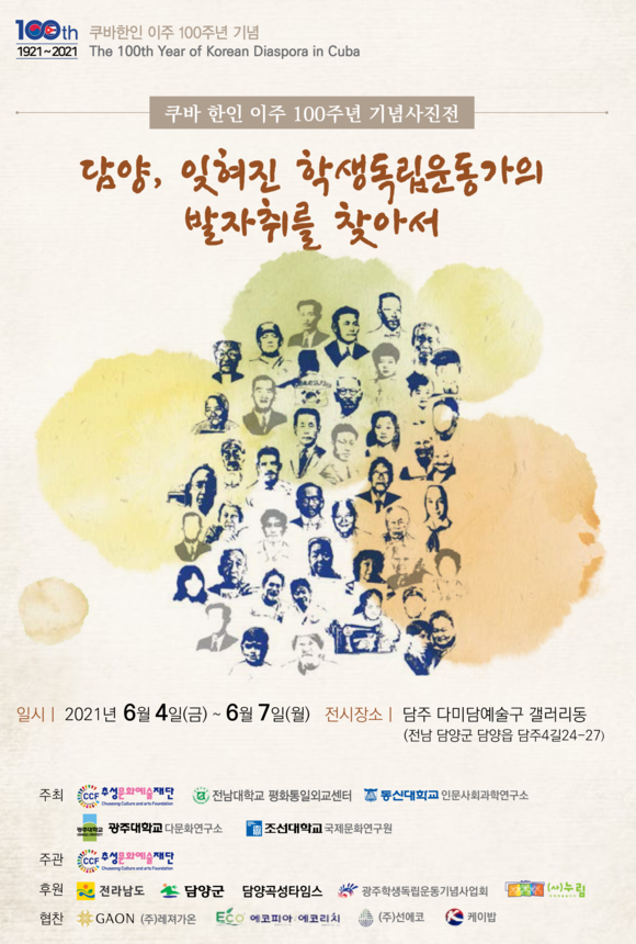 담양군은 새롭게 꾸며진 문화복합 공간인 담주 다미담예술구에서 ‘담양, 잊혀진 학생독립운동가의 발자취를 찾아’라는 주제로 ‘쿠바 한인 이주 100주년 기념 초청 사진전’이 열린다고 밝혔다.