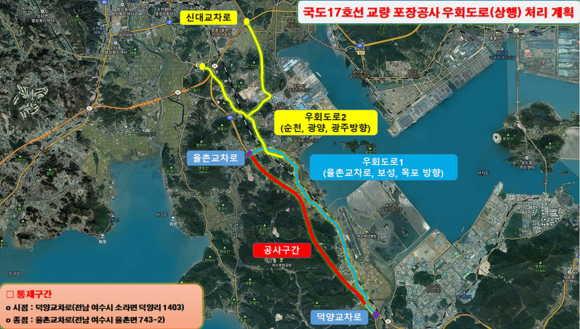 이번 공사는 순천국토관리사무소(소장 김철중)가 추진하며, 여수∼순천 간 도로에 위치한 교량 5개 보수를 위해 부득이 덕양교차로에서 율촌교차로까지 총 11km에 대해 전면 통제를 실시한다.