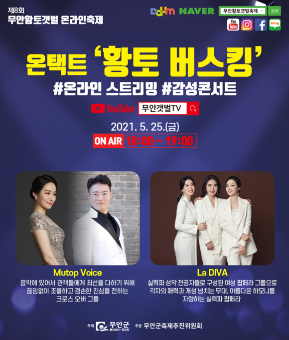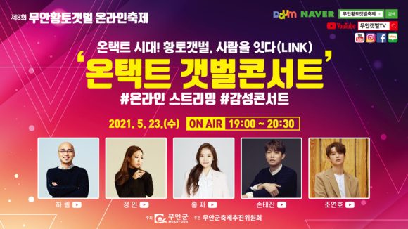 이와 함께 여행유튜버 여락이의 감성충만 무안여행과 진석기시대 무안갯벌체험 영상을 통해 축제현장을 방문하지 못하는 아쉬움을 달래며 무안의 숨은 매력을 알리고 아름다운 갯벌랜드를 배경으로 하림, 정인, 홍자와 팬텀싱어 우승자 손태진이 만드는 감성 가득한 콘서트도 집에서 관람이 가능하다.