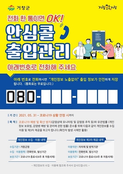 경남 거창군은 코로나19 선제적 대응을 위해 전화 한 통으로 이용자들의 출입기록이 관리되는 '안심콜 출입자관리 시스템'을 관내 2500여 개 사업체에 도입한다고 4일 밝혔다.