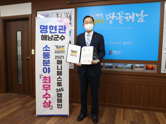명현관 군수는 현장행정을 중심으로 한 이동군수실 현장톡톡을 연간 운영해 군민들과 지속적으로 소통하며 열린 군정을 구현해 오고 있다. 특히 민선 7기 군정역점과제로 소셜미디어(SNS) 마케팅 강화를 추진, 페이스북과 유튜브 등을 통해 군정시책과 해남의 역사, 문화 관광, 특산물 등을 알려나가는 한편 전국 최초 군민 전용앱인 해남소통넷을 개설하는 등 온라인을 통해 적극 소통한 부분을 높게 평가 받았다.