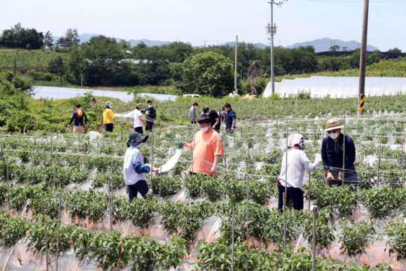 직원들은 8,900㎡의 고추밭에서 지주대 설치 및 그물망씌워서 묶기 등의 작업을 하며 농촌 고령화에 따른 일손부족 및 신종 코로나바이러스 감염증 장기화 등으로 외국인 근로자의 수급까지 원활하지 못한 상황에서 서툴고 작은 손길이지만 공직자부터 농촌일손돕기에 솔선수범하는 마음으로 농가의 어려움을 함께하는 시간을 가졌다.