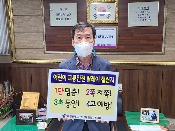 이상연 글로벌선도기업협회 경남지회장(경한코리아 회장)과 양재부 창원국가산업단지 경영자협의회장(신스윈 대표이사)이 '어린이 교통안전 릴레이 챌린지'에 동참했다.