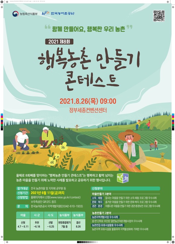 한국농어촌공사(사장 김인식)는 주민과 지자체가 협력해 활력 있는 농촌마을을 만든 사례를 경연하는「제8회 행복농촌 만들기 콘테스트」 참여를 11일까지 온라인으로 접수한다.
