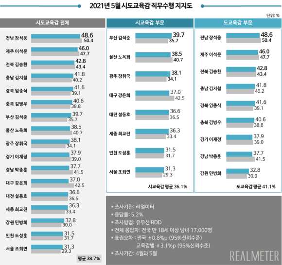 전국 교육감 17명의 2021년 5월 평균 지지율은 38.7%이다.