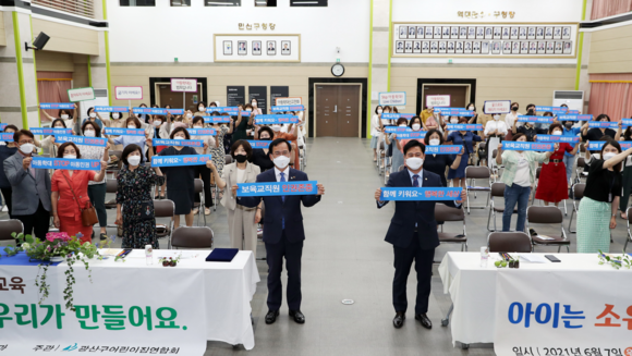 광주 광산구(구청장 김삼호)가 지난 7일 광산구청 7층 윤상원홀에서 관내 보육교직원 80여 명과 함께 ‘아동학대 근절 안심보육 자정 결의대회’를 실시했다.