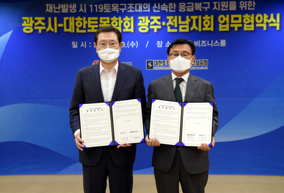 광주광역시는 9일 오전 시청 비즈니스룸에서 대한토목학회 광주‧전남지회와 119토목구조대 활성화 업무협약을 체결하고 재난 발생 시 신속한 응급복구와 현장 대처를 위한 24시간 현장 자문 및 기술지원 체계를 구축하기로 했다.