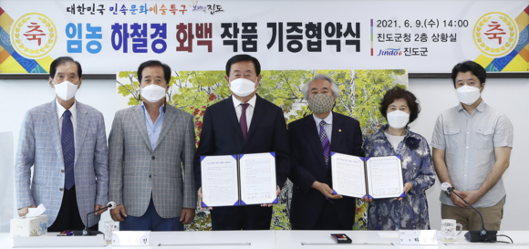 진도군은 지난 9일 이동진 군수와 임농 하철경 화백 등이 참석한 가운데 ‘임농 하철경 화백 작품 기증 협약식’을 체결했다.