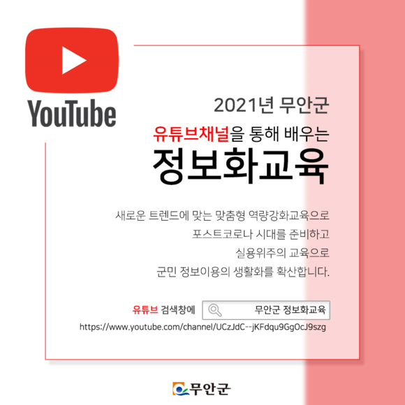 무안군(군수 김산)은 지난 1일부터 유튜브와 블로그 등을 통한 온라인 정보화교육 서비스를 실시해 군민들의 큰 호응을 얻고 있다.