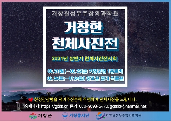 경남 거창군은 오는 21일부터 7월 4일까지 군청 로비와 창포원 열대식물원에서 '2021년 상반기 거창한 천체사진전'을 개최한다.