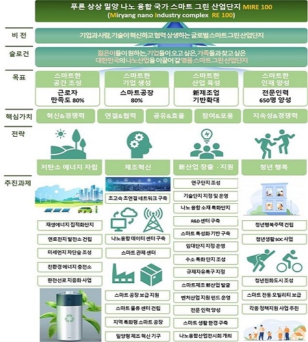 밀양시가 계획하는 스마트 그린 산단 조성은 저탄소·에너지 자립형 그린 산업단지(RE100 실현 산업단지) 조성, 제조혁신이 이루어지는 첨단산업단지 조성, 신산업 창출․지원을 통한 지속 가능한 산업단지 조성, 청년이 머물고 일하며 꿈꾸고 함께 살아가는 청년 행복 산업단지 조성 등 4개의 사업 분야에 31개의 세부사업을 담고 있다.