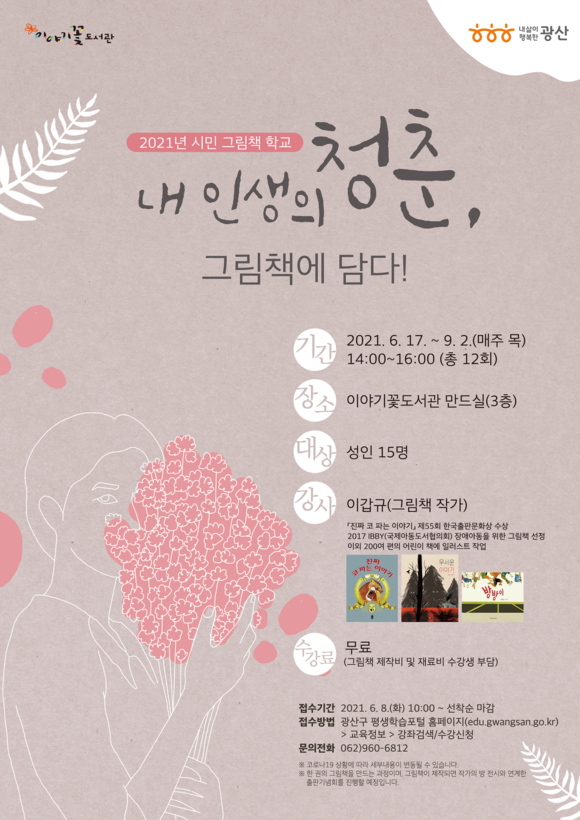 광주 광산구(구청장 김삼호) 이야기꽃도서관이 17일부터 성인들을 대상으로 나만의 그림책 만들기 프로그램 ‘시민 그림책 학교: 내 인생의 청춘, 그림책에 담다!’를 운영한다.