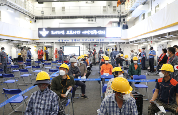 진도군이 의료기관이 없는 조도면 섬 지역 백신 접종 희망자를 대상으로 해군 훈련함인 한산도함에서 코로나19 예방접종을 실시하고 있다.