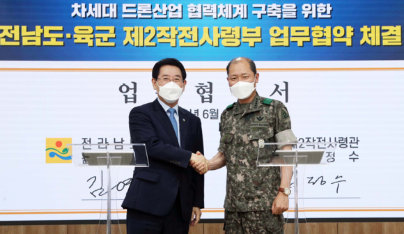 전남도는 16일 도청 서재필실에서 육군 제2작전사령부(사령관 대장 김정수)와 ‘차세대 드론산업 협력체계 구축’ 업무협약을 했다.