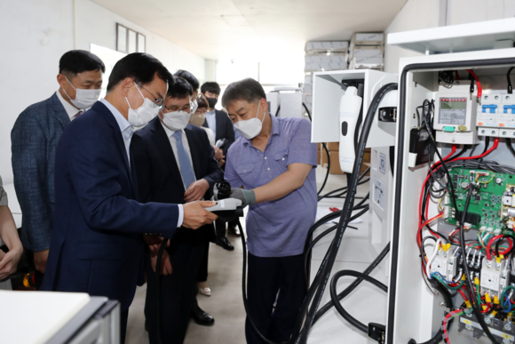 김삼호 광산구청장이 17일 오전 ㈜삼성EVC 공장(송정동)에서 열린 전기차 충전기 시제품 검정(봉인) 행사에 참석했다.