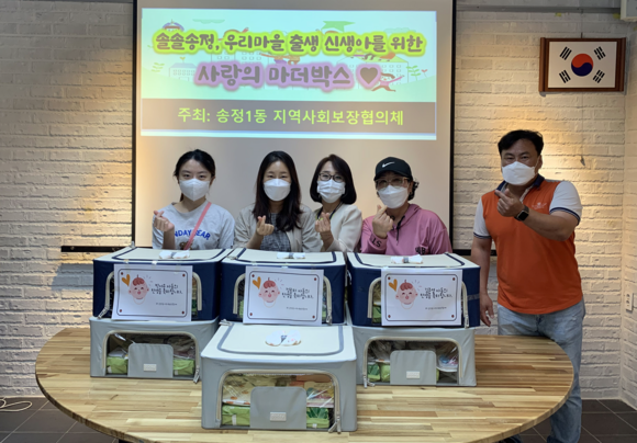 광주 광산구 송정1동 지역사회보장협의체(위원장 기영철, 이하 지사협)가 최근 관내 출생 신생아 7명을 위해 해당 가정에 출산 축하 용품 ‘송정1동형 마더박스’를 전달했다.