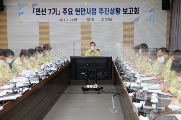 고흥군이(군수 송귀근) 21일 고흥군청 흥양홀에서 군수 주재로 금년 들어 두 번째 민선 7기 주요 현안사업 추진상황 보고회를 개최했다.