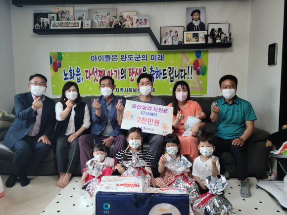 완도군 노화읍에서 다섯째 아이를 출산하며 지역 인구 늘리기에 힘을 보탠 부부가 있어 노화읍 지역사회보장협의체가 격려에 나섰다.