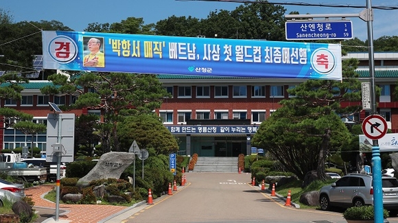 21일 박 감독의 고향인 산청군 일대는 '박항서호 사상 첫 월드컵 최종예선 확정' 등 박 감독과 베트남 대표팀의 활약을 축하하는 문구가 적힌 현수막이 일제히 내걸렸다.