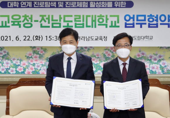 전라남도교육청(교육감 장석웅)과 전남도립대학교(총장 박병호)가 22일 전라남도교육청 비즈니스실에서 대학 연계 진로탐색 및 진로체험 활성화를 위한 업무협약(MOU)을 체결했다.