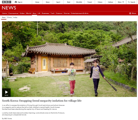 BBC는 영상과 함께 “한국 대도시 가정들이 코로나로 인한 자녀들의 친구 관계 단절, 우울감 등 정신적 문제를 해결하고 자연 속에서 즐겁게 배우게 하기 위해 농산어촌학교로 유학을 선택하고 있다.”는 메시지를 전했다. 이어, “폐교 위기에 처했던 농촌학교들은 개인 맞춤형 수업과 생태환경교육 덕분에 학생 수가 늘어나는 즐거움을 누리고 있다.”고 소개했다.
