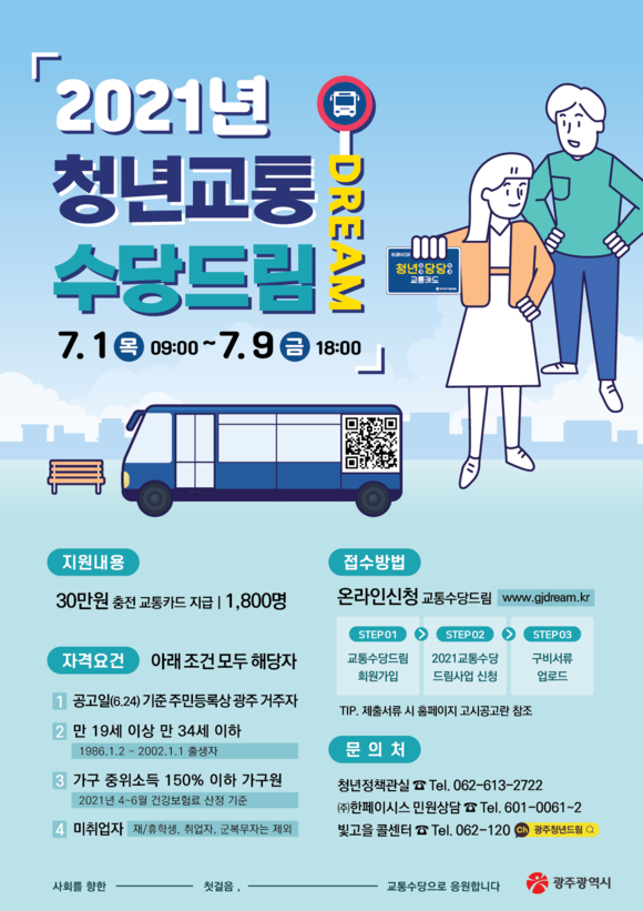 자세한 사항은 시 홈페이지나 청년 교통수당 드림 홈페이지를 통해 확인할 수 있으며 한페이시스 상담센터(601-0061), 카카오톡 플러스친구(광주청년드림) 문의도 가능하다.