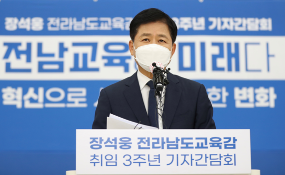 장석웅 주민직선 3기 전라남도교육감이 24일오전 전라남도교육청 2층 대회의실에서 취임 3주년 기자간담회를 갖고 “더 큰 변화와 혁신으로 지속가능 전남교육의 탄탄한 미래를 열겠다.”고 다짐했다.