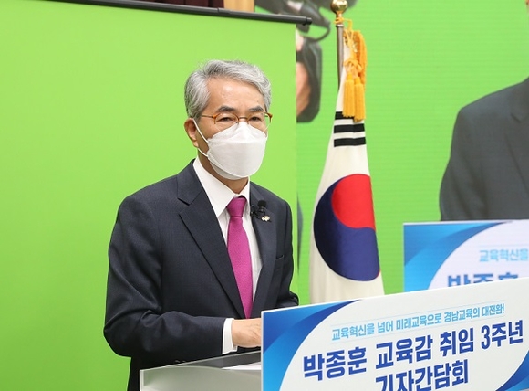 박종훈 경남도교육감이 24일 오전 본청 강당에서 취임 3주년 기자간담회를 갖고 “올해 경남교육 대전환의 성과를 바탕으로 경남형 빅데이터 및 인공지능 개발, 미래교육테마파크 및 경남진로교육원 개관 등으로 새로운 시대를 여는 미래교육체제의 초석을 공고히 하겠다”고 밝혔다.
