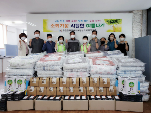 무안군지역사회보장협의체(공공위원장 김산, 민간위원장 정길수) 지난 23일 조손가정 및 장애가정 109세대에 여름이불세트, 양말, 마스크, 버섯진액을 전달하며 소외가정의 시원한 여름나기를 지원했다.