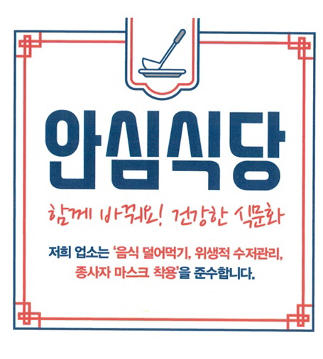 시 관계자는 “코로나19로 인한 외식기피로 외식업계 경영난과 음식점 이용에 대한 불안감을 해소하기 위해서는 식문화 변화가 불가피한 상황”이라면서, “개인 안전도 지키고 외식업계 경영난도 타계할 수 있는 안심식당 지정과 이용에 적극 동참해 달라”고 당부했다.