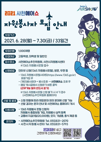 경남 사천시는 '2021 사천에어쇼'의 성공적인 개최와 원활한 진행을 위해 오는 7월 30일까지 자원봉사자 1000명을 모집한다고 29일 밝혔다.