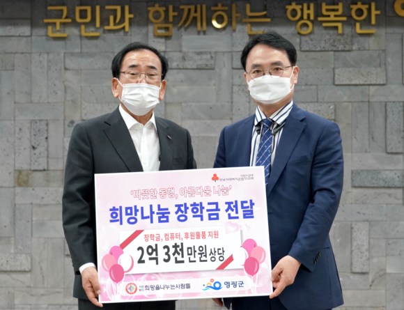 영광군(군수 김준성)과 (사)희망을나누는사람들(회장 김정안)은 29일 ‘2021년 희망나눔장학금후원을 위한 MOU협약식 및 장학금수여식’을 개최했다.