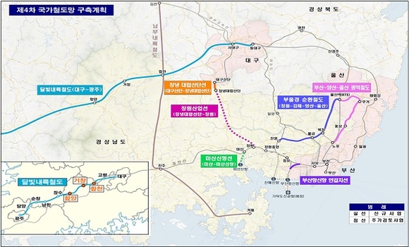 경남도의 창녕대합산단산업선, 부산항신항연결지선, 달빛내륙철도 등 일반철도 3개 노선, 부울경 순환철도, 부산-양산-울산 광역철도 등 광역철도 2개 노선 총 5개 사업 7조 9947억 원이 반영됐다.