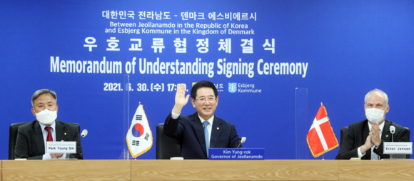 이날 화상으로 진행한 협정식에는 김영록 전남도지사와 예스퍼 프로스트 라스무센 에스비에르시장이 참석했다. 이들은 해상풍력 등 신재생에너지와 기후변화 대응에 중점을 두고 우호교류를 이어가기로 뜻을 모았다.