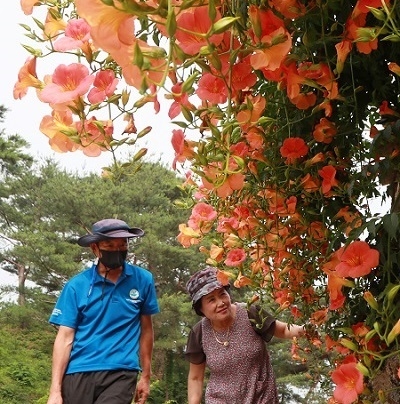 1일 경남 함양군 지곡면 개평한옥마을 담벼락에 능소화가 활짝 피어 있다. (사진=함양군 제공)