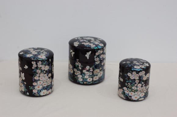 ‘화려한 외출’은 물푸레나무로 백골(목기)을 깎아 여러 차례 건조와 다듬는 과정을 거치고, 옻칠을 반복해 국화꽃 문양 자개를 붙여 만들었다.