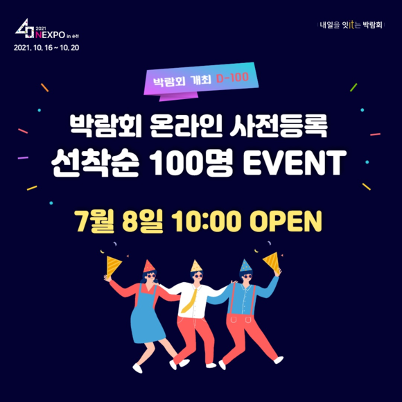 순천시(시장 허석)는 ‘2021 NEXPO in 순천’의 개최 D-100일을 맞아 전 국민 참여 분위기를 조성하기 위해 온라인 사전등록 이벤트를 진행한다.
