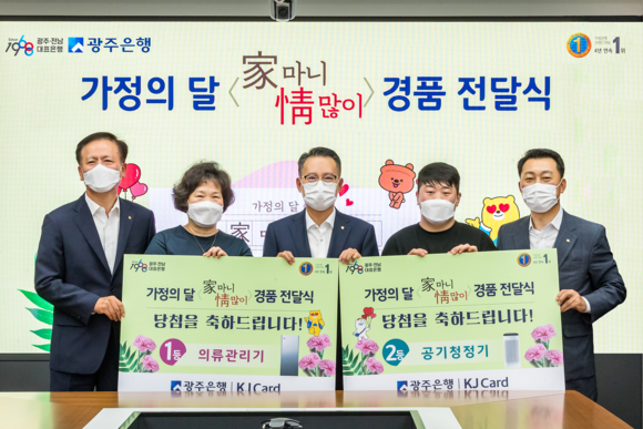 광주은행(은행장 송종욱)은 본점에서 KJ카드 개인고객을 대상으로 펼친 ‘家 마니 情 많이’ 이벤트의 당첨자에 대한 경품 증정식을 가졌다고 밝혔다.