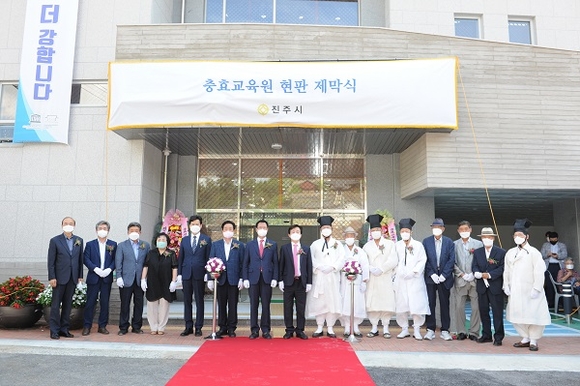 경남 진주시는 13일 오후, 증가하고 있는 전통 예절교육 및 인성교육 실시를 위해 신축한 진주시 충효교육원 별관의 현판 및 기문 제막식을 가졌다.