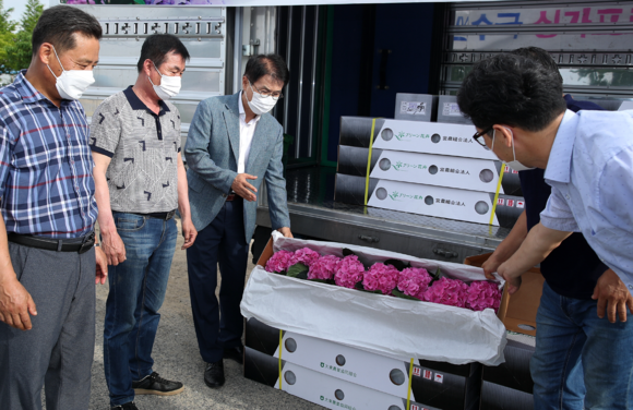 강진군은 지난 13일 그린화훼 수국 재배 법인 회원과 군 관계자 20여 명이 모여 국내 최초 수국 싱가포르 수출 상차 기념식을 가졌다고 밝혔다. 행사는 코로나19 확산 예방을 위해 방역지침을 준수하며 최소화해 진행됐다.