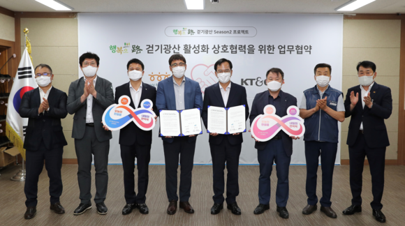 광주 광산구(구청장 김삼호)와 KT&G 전남본부가 14일 오전 광산구청 2층 상황실에서 ‘행복으路(로) 걷기광산’ 활성화를 위한 시민 면역력 증진 프로젝트 업무협약을 체결했다. ‘걷기광산 시즌2’의 막이 오른 것.