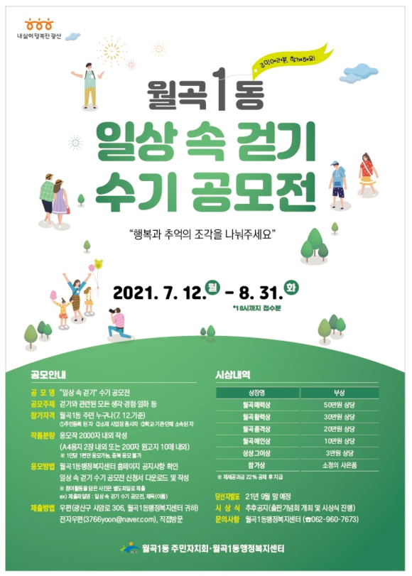 8월31일까지 월곡1동 행정복지센터에서 지역 주민들을 대상으로 걷기를 주제로 한 다양한 수기를 모집한다. A4용지 2~3면 이내로 작성해 우편이나 이메일 또는 직접 방문하여 제출하면 된다. 공모에 대한 자세한 사항은 월곡1동 홈페이지 또는 광산구 걷기앱 ‘워크온’ 공지사항을 통하여 확인할 수 있다.