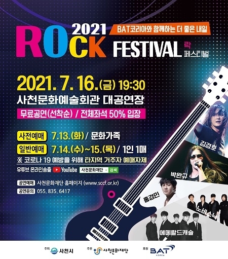 사천문화재단은 코로나19 확산을 방지하기 위해 실내공연으로 변경했던 'BAT 코리아와 함께하는 사천 락 페스티벌'의 입장도 사천시민으로 제한하기로 결정했다고 14일 밝혔다.
