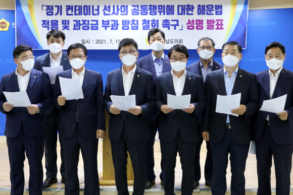 전라남도의회 여수 광양항 활성화 특별위원회(위원장 민병대 이하 특위)는 15일 정기 컨테이너 선사의 공동행위에 대한 해운법 적용과 과징금 부과 방침을 철회할 것을 촉구하는 성명을 발표했다.