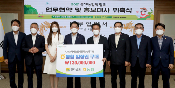 (재)전남국제농업박람회(이사장 김영록)는 16일 도청 서재필실에서 ‘2021 국제농업박람회’ D-100을 즈음해 비즈니스 박람회로서 성공적 개최를 위한 ‘업무협약식’과 ‘홍보대사 위촉식’을 개최했다.