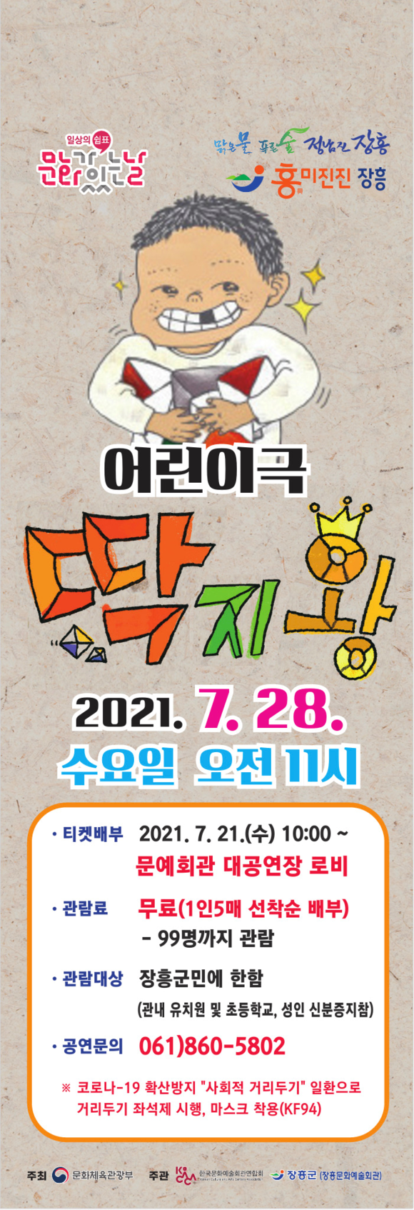 장흥군은 오는 7월 28일 오전 11시 장흥문화예술회관 대공연장에서 ‘코로나19 방역 수칙’을 준수하여 공연을 개최한다.