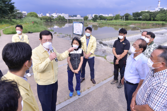 이용섭 광주광역시장은 16일 오후 광주천 중보를 찾아 북구 운암동 공구의 거리 상인회와 지역주민들과 함께 집중폭우에 따른 광주천 역류 및 침수 예방 대책을 논의했다.