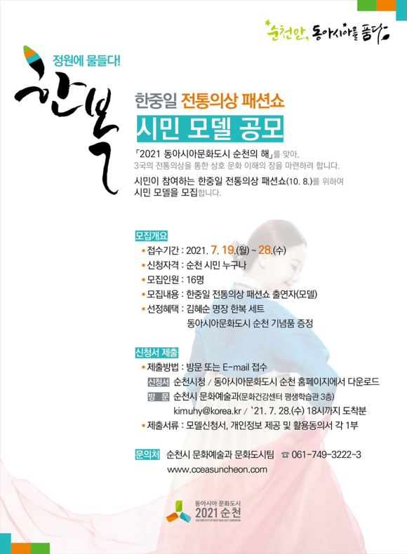 순천시(시장 허석)가 2021 동아시아문화도시의 해를 맞아 진행하는 ‘한중일 전통의상 패션쇼’에 참여할 시민모델을 모집한다.