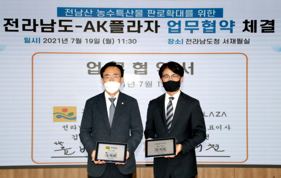 전라남도와 AK플라자는 19일 코로나19로 판매에 어려움이 있는 농어가와 소상공인을 위해 전남산 농수특산물 판로 확대 업무협약을 했다.