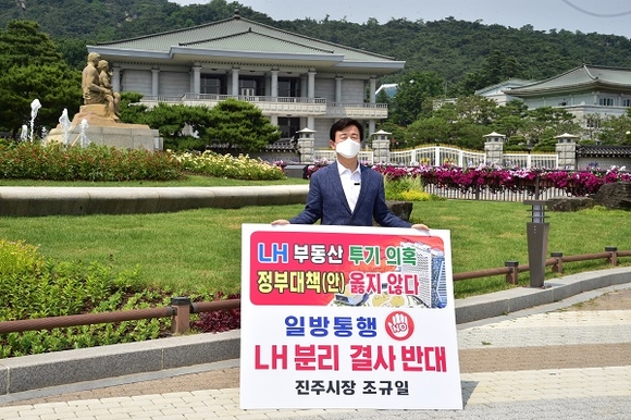 지난 6월 7일 지역사회 여론을 전달하기 위해 국회를 방문하기로 예정돼 있던 조규일 진주시장이 당일 정부의 LH 해체안 발표소식을 듣고 서울정부청사 앞으로 달려가 1인 시위에 나섰다.